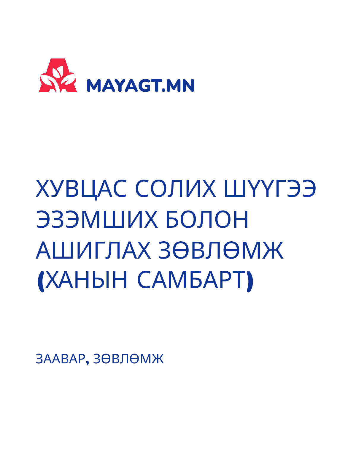ХУВЦАС СОЛИХ ШҮҮГЭЭ ЭЗЭМШИХ БОЛОН АШИГЛАХ ЗӨВЛӨМЖ (ХАНЫН САМБАРТ)