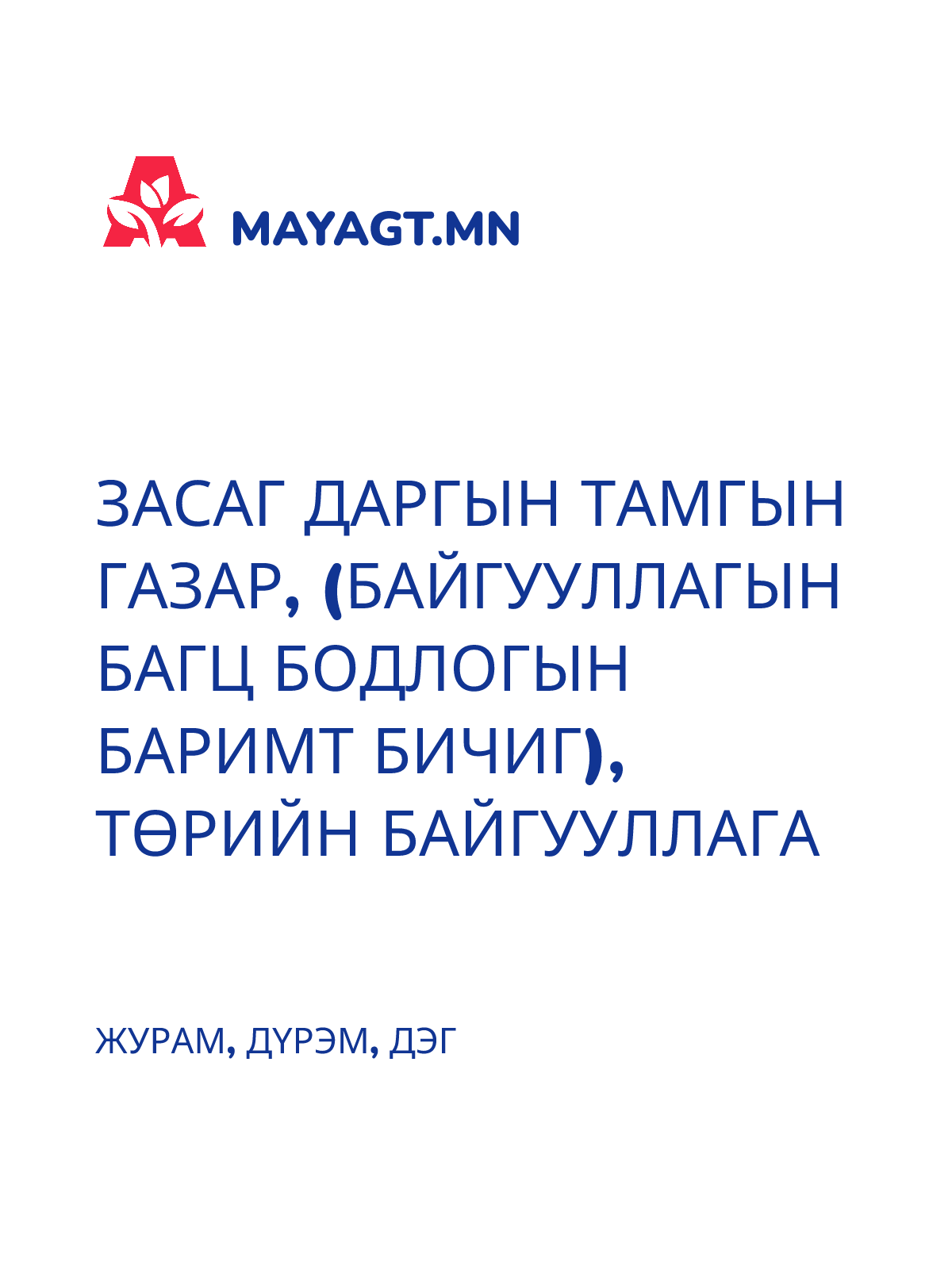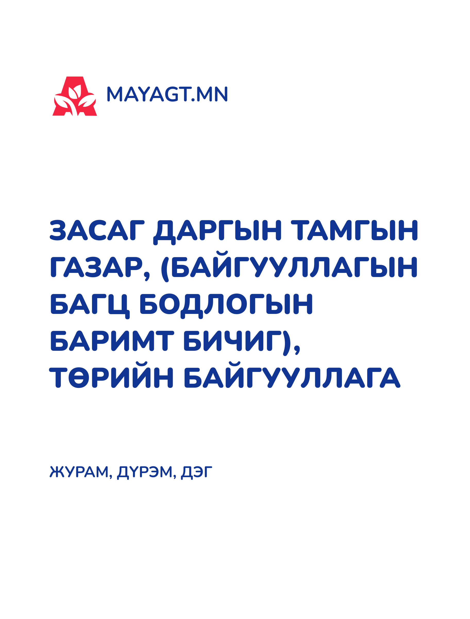 УУЛ УУРХАЙ-ХАЙГУУЛ, ОЛБОРЛОЛТ, ХУДАЛДАА, ТЭЭВЭР (БАЙГУУЛЛАГЫН БАГЦ БОДЛОГЫН БАРИМТ БИЧИГ)
