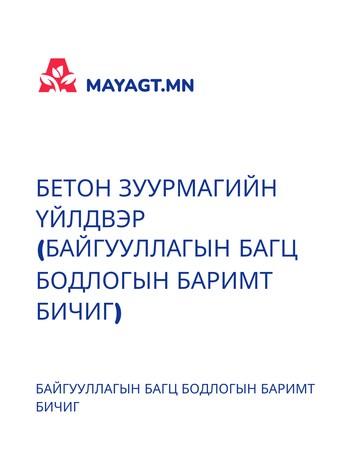 БЕТОН ЗУУРМАГИЙН ҮЙЛДВЭР (БАЙГУУЛЛАГЫН БАГЦ БОДЛОГЫН БАРИМТ БИЧИГ)