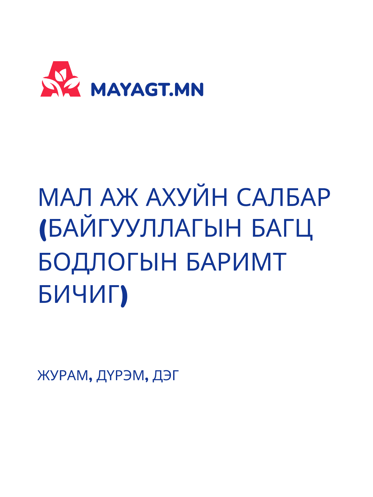МАЛ АЖ АХУЙН САЛБАР (БАЙГУУЛЛАГЫН БАГЦ БОДЛОГЫН БАРИМТ БИЧИГ)