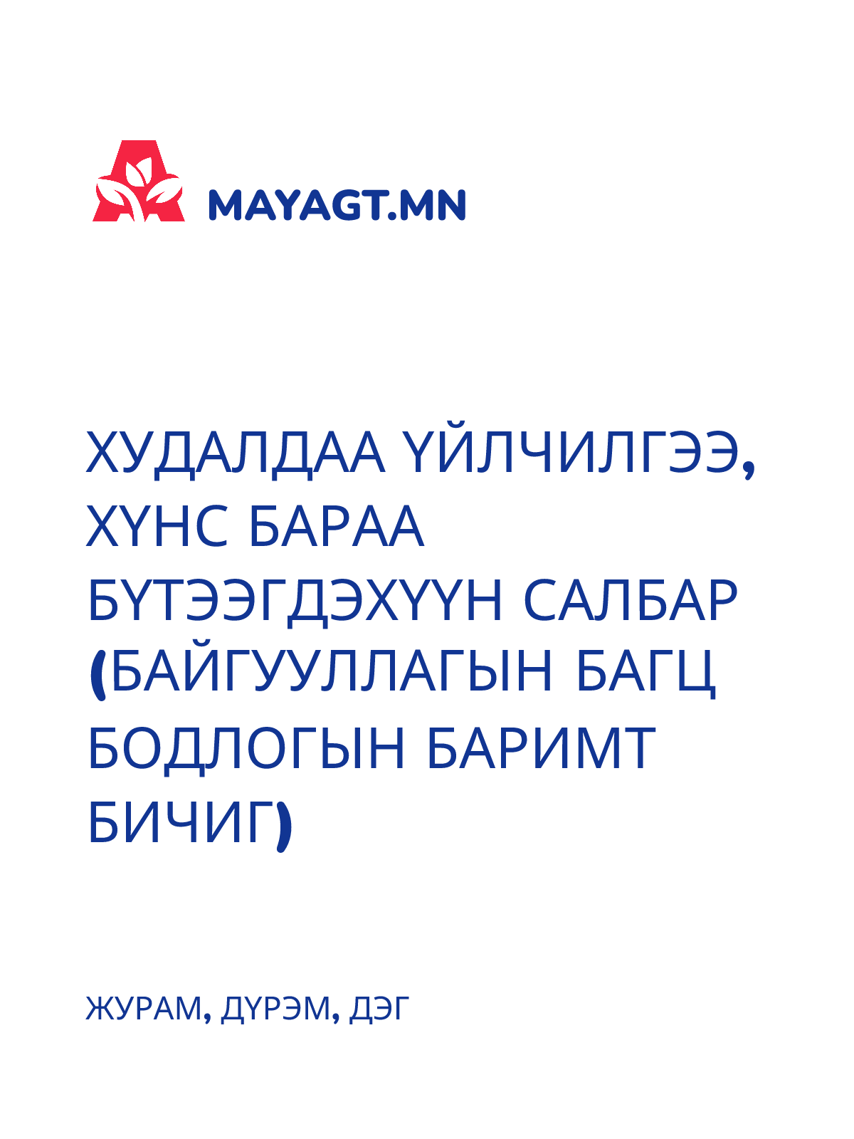 ХУДАЛДАА ҮЙЛЧИЛГЭЭ, ХҮНС БАРАА БҮТЭЭГДЭХҮҮН САЛБАР (БАЙГУУЛЛАГЫН БАГЦ БОДЛОГЫН БАРИМТ БИЧИГ)