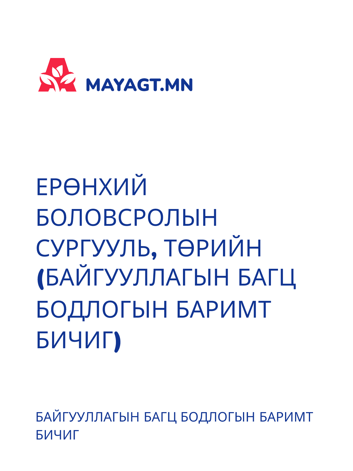 ЕРӨНХИЙ БОЛОВСРОЛЫН СУРГУУЛЬ, ТӨРИЙН (БАЙГУУЛЛАГЫН БАГЦ БОДЛОГЫН БАРИМТ БИЧИГ)