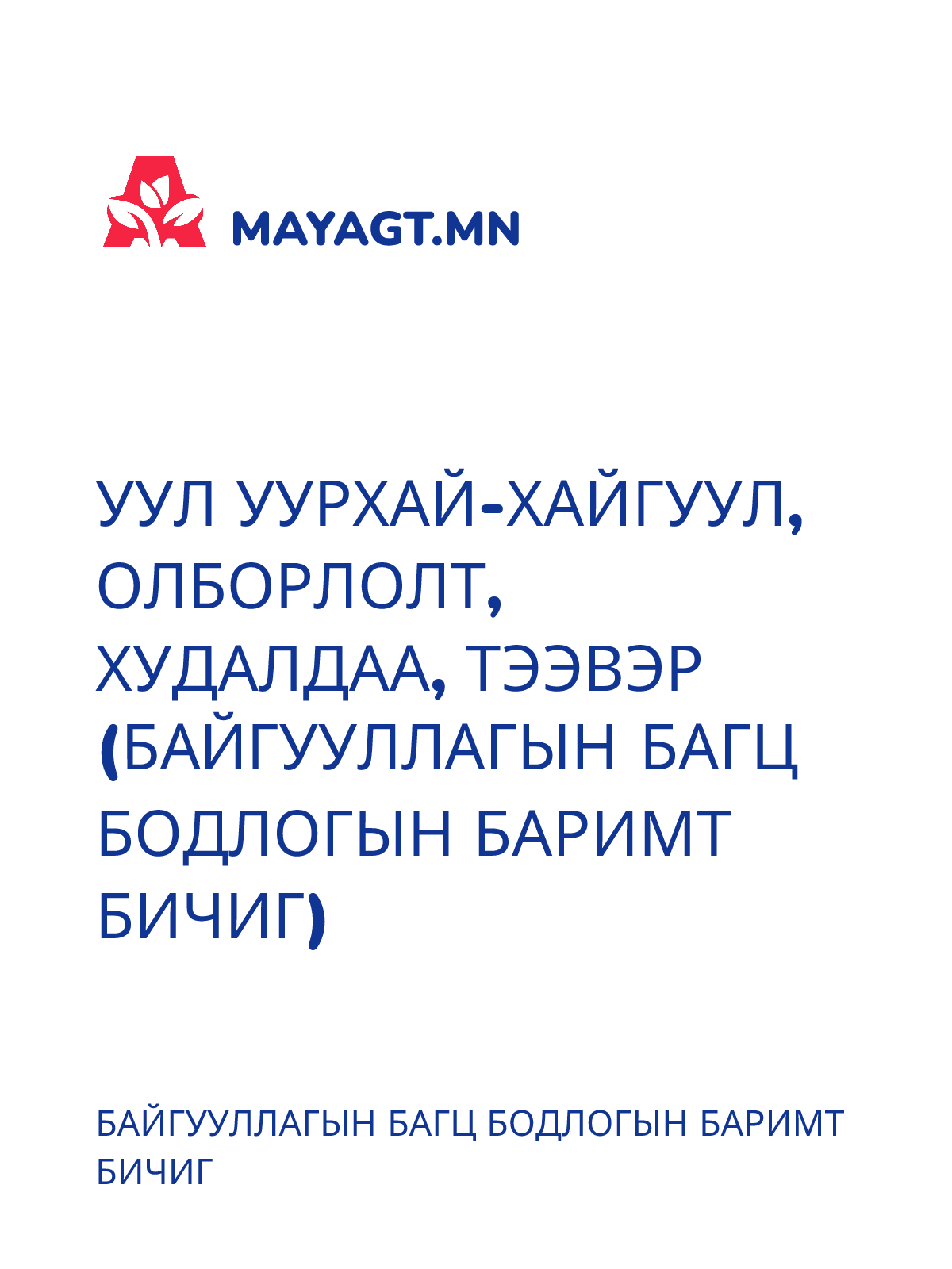 УУЛ УУРХАЙ-ХАЙГУУЛ, ОЛБОРЛОЛТ, ХУДАЛДАА, ТЭЭВЭР (БАЙГУУЛЛАГЫН БАГЦ БОДЛОГЫН БАРИМТ БИЧИГ)